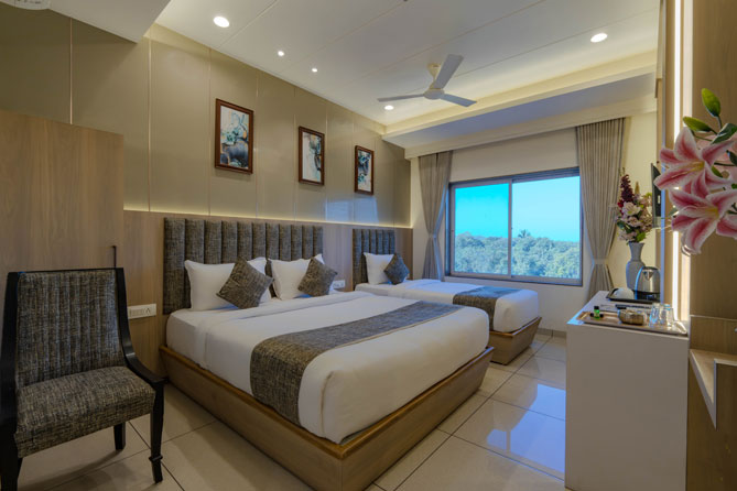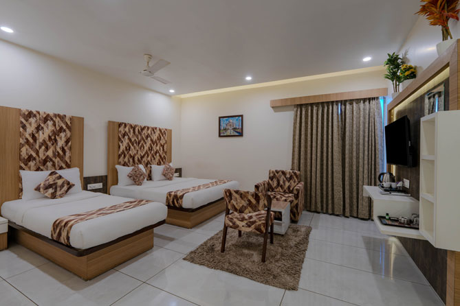 Spread over 240 sq. ft. (22 Sq. Mt.), our Executive Rooms of Hotel Bhilad Gate are best suited for families or a larger group of people. Eye Catching colours balance its subtle interiors. It has one large double bed and One Single Bed, a work desk, comfortable upholstery and the other basic facilities.