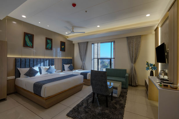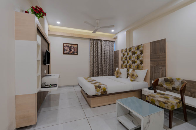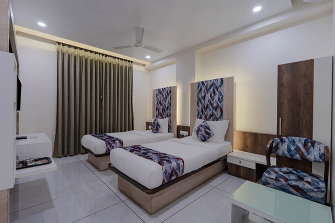 Spread over 240 sq. ft. (22 Sq. Mt.), our Executive Rooms of Hotel Bhilad Gate are best suited for families or a larger group of people. Eye Catching colours balance its subtle interiors. It has one large double bed and One Single Bed, a work desk, comfortable upholstery and the other basic facilities.